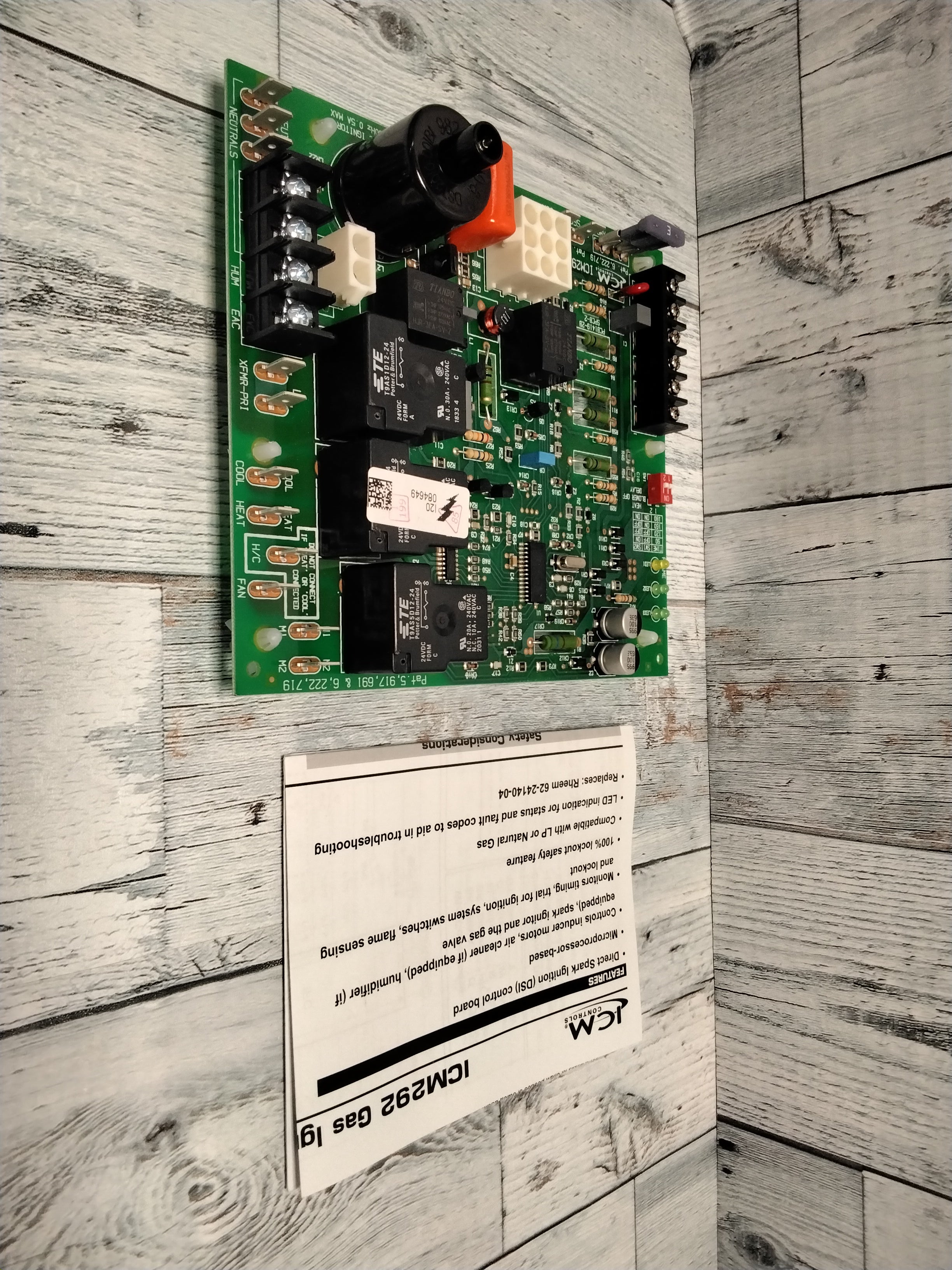 *FOR PARTS/NOT WORKING* Item wasn't able to be tested so listing as parts only. See images for item condition. Everything included with the item can be seen in the images. ICM292 Gas Ignition Control Board Low cost, direct replacement ignition control Features: Direct Spark Ignition (DSI) control board Microprocessor-based Controls inducer motors, air cleaner (if equipped), humidifier (if equipped), spark ignitor and the gas valve Monitors timing, trial for ignition, system switches, flame sensing and lockout 100% lockout safety feature Compatible with LP or Natural Gas LED indication for status and fault codes to aid in troubleshooting Specifications: Control voltage: 24 VAC (18-30 VAC), 60 Hz Line voltage: 115 VAC, 60 Hz Power consumption: 0. 3A plus gas valve current at 24 VAC Operating temperature: -40C (-40F) to 75C (176F) Timing -Pre-purge: 30 seconds -Trial for ignition: 7 seconds - Retries: Two groups of two, 30 seconds delay within the group and 3minutes delay between groups -Lockout: 1 hour - Post-purge: 90, 120, 160 and 180 seconds Inputs - Power: 24 VAC and COM -Thermostat interface: R, W, Y and G - System switches: Vent Pressure and Limit switches (Main and Over-temperature switches in series) - Flame Sensing - Heat blower OFF delay miniature slide switch set Outputs - Spark - Gas Valve: GV - Inducer draft motor: IDM - Blower motor: FAN, COOL and HEAT speeds - Electric Air Cleaner: EAC - Humidifier relay: HUM - Heat/Cool relay: H/C LED indicators - Power, green LED: PWR - Status, green LED: OK - Flame status, yellow LED: FLAME Used in Honeywell, Rheem, Ruud Heat Controller, Weather king Furnace Models and many more that are not listed here: GLH-06EAUEA, GLH-07EAMGA, GLH-07EAUEA, GLH-10EAMEA, GRA-07EYBG278 and GTA-07EYBG278. Replacement for Obsolete Circuit Board Part Numbers: 62-24140-0 From the Manufacturer Rheem is the industry leader for total heating, cooling and water heating solutions. In fact, Rheem is one of the few global brands with product offerings covering residential and commercial heating, cooling, conventional storage-style water heaters, tankless water heaters, solar water heating systems, replacement parts and accessories for all categories-making us a one-stop solutions provider.