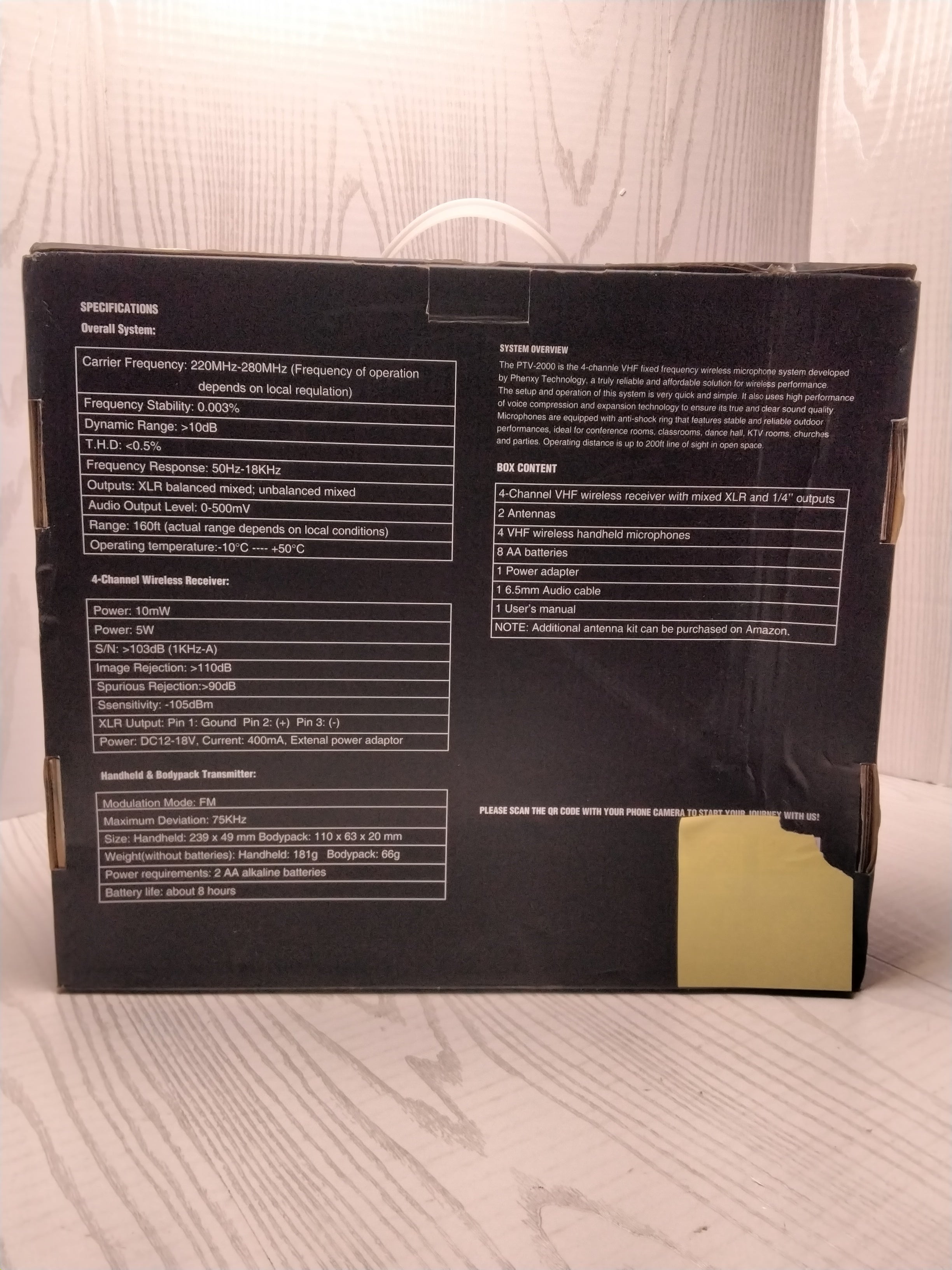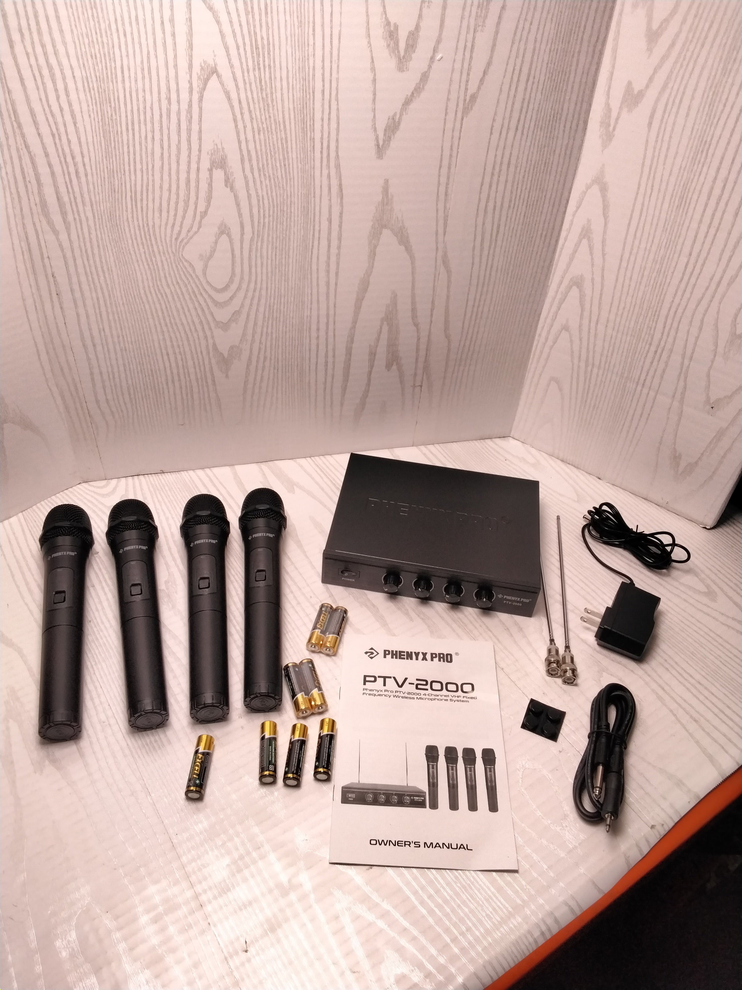 - BOX CONTENTS: 1 x 4-channel wireless mic receiver, 4 x handheld wireless mics, 1 x 1/4 audio cable, 1 x power adapter, 1 x user manual, 8 x AA battery for 16hrs long hour use, 1 x 6.5mm to 3.5mm jack adapter